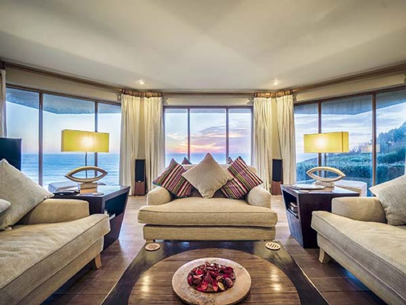 Guests staying in the master bedroom are in for a treat - the ceiling has been incredibly painted to create a 3D starry night effect and the feature domed window offers incredible sea views.