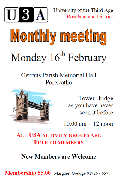 See Tower Bridge as you as never seen it before. 10am - Noon 16th February 2009 Gerrans Parish Memorial Hall, Portscatho, Cornwall. New members are welcome. All Activity Groups are free for members. Membership costs £5.00 U3A Roseland and District.