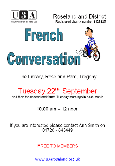 U3A Roseland and District have a French Conversation Group at The Library, Roseland Parc, Tregony to be held on Tuesday 22nd September from 10am - 12 noon.