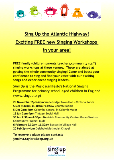 FREE family (children,parents,teachers,community staff) singing workshops at these venues.