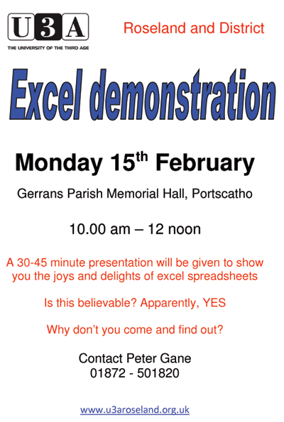 Monthly meeting of the U3A Roseland and District. Peter Gane demonstrates the day to day uses of the Excel Spreadsheet. Monday 15th February. 10am - 12 noon. Gerrans Parish Memorial Hall, Portscatho. This replaces the Truro Library Project meeting which has been cancelled.