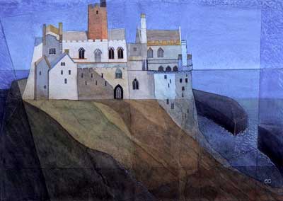 ‘Homage (to Hamish Miller)’ by Liz Cleves. This water colour was painted as a response to the life of Hamish Miller, a local social philosopher and writer. It depicts St Michael’s Mount that is a favourite subject of the artist.