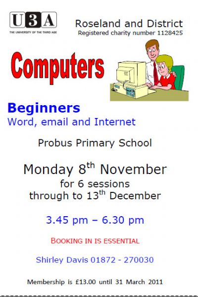 U3A Roseland and District is starting computer courses for beginners starting Monday 8th November at Probus Primary School.