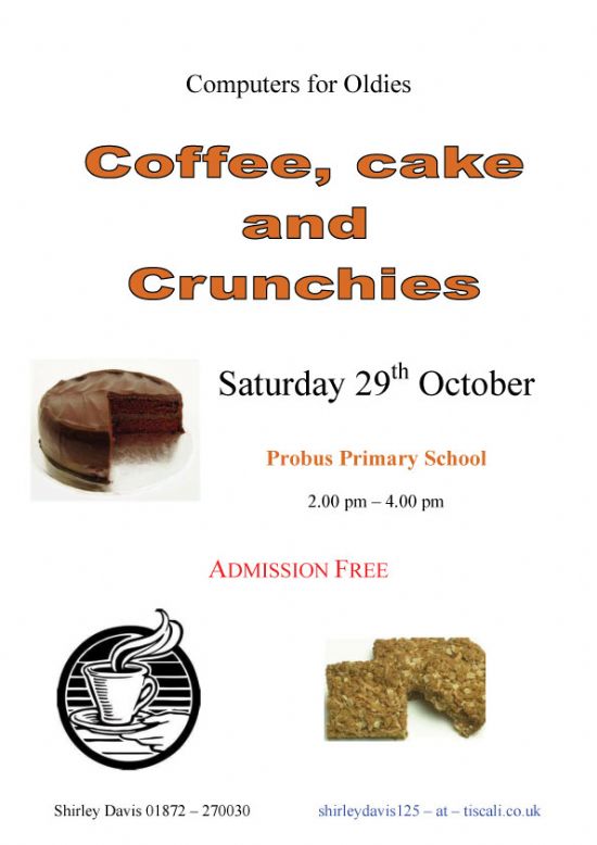 Saturday 29th October is a date for your diary as more fund-raising is to take place by students of Computers for Oldies. The event is to be a social get-together, sit down and chat over coffee (or tea), cake and crunchies at Probus Primary School from 2.00 pm to 4.00 pm. Admission will be free. As with the very successful cream tea held in July there will be sales tables, for which goods to sell are now being collected.