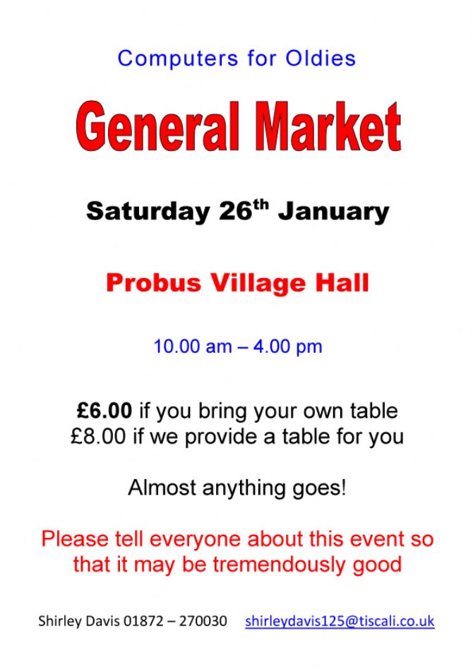 A fund-raising market has been planned for Saturday 26th January at Probus Village Hall from 10.00 am to 4.00 pm (setting up at 9.00 am). Stall-holders are being sought, and your help is needed if this event is to succeed. Please tell everyone you know about the market so that they may visit or take a table. Refreshments can be sold and the franchise of this will go to the highest bidder. Do you know anyone who might be interested in making money for themselves or their own charity?