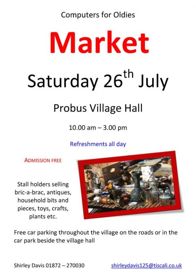 Computers for Oldies Market Saturday 26th July 2014 Probus Village Hall 10.00 am – 3.00 pm Refreshments all day ADMISSION FREE Stall holders selling bric-a-brac, antiques, household bits and pieces, toys, crafts, plants etc. Free car parking throughout the village on the roads or in the car park beside the Village Hall