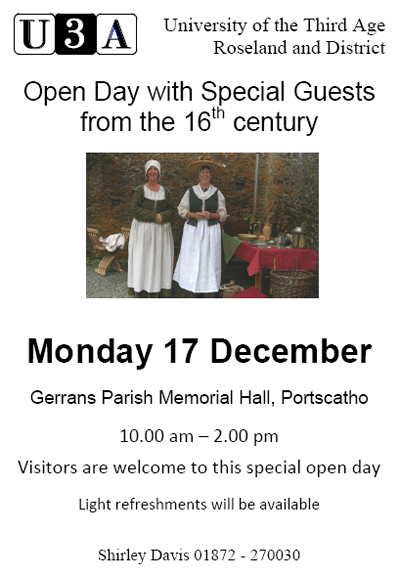Everyone is invited to meet and talk with Master James Wood and Mistress Rebecca Bowden (from the late 16th-century) as they are making a special journey to be with the University of the Third Age Roseland and District for this occasion.