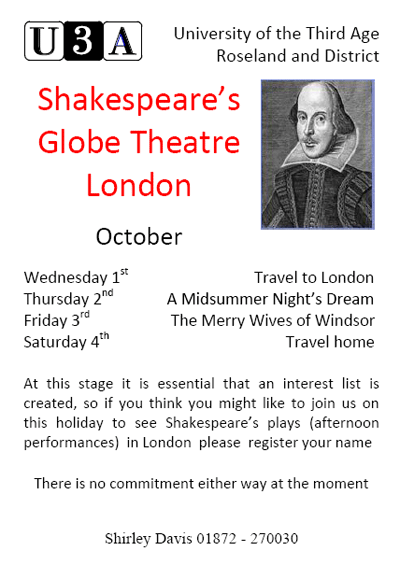 The University of the Third Age Roseland and District has obtained dates for their proposed 4-day coach holiday to London. Plans are to travel by Truronian Coaches to London on Wednesday 1st October, see A Midsummer Night's Dream at 2.00 pm on Thursday 2nd, and The Merry Wives of Windsor on Friday 3rd at 2.00 pm at Shakespeare's Globe theatre. We then travel home on Saturday 4th having had our fill of Shakespeare and the sites and sounds of London, where you could visit art galleries in the morning, have lunch in one of the restaurants along the South Bank, see a West End show in the evening - or just relax with pleasant company. The choice is yours. Tickets to Shakespeare's Globe theatre, sitting under the gallery, are £33.00 for each performance. As Shakespeare's Globe theatre demands full payment within three weeks of reservation of seats, we will also have to confirm the coach and hotel at an approximate cost of £10,000. Therefore, it is advisable for you to register your interest with Shirley Davis on 01872 - 270030 so that details may be sent to you immediately they are known. A £50 deposit for the coach and hotel will be required, along with the full cost of the Shakespeare tickets.