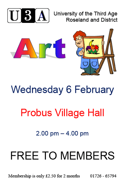 existence one year, in Probus Village Hall from 2.45 pm to 4.45 pm. Many different aspects of artwork have been carried out, and members are experimenting all the time. If you would like to take part in this relaxing and educational group, you may do so - free of charge once you are a member. Membership is £2.50 for February and March, details from Margaret Goudge on 01872 - 65794.