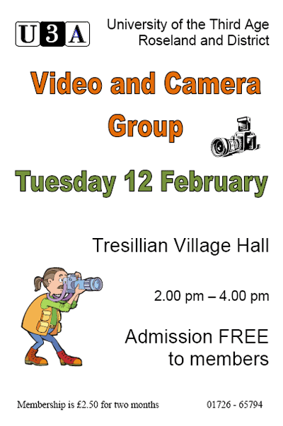 Tresillian Village Hall from 2.00 pm to 4.00 pm this group hopes to explore the use of camcorders and digital cameras. If you would like to come along, please do so and be prepared to pay £2.50 for membership of U3A Roseland for February and March. Details are from Shirley Davis on 01872 - 270030