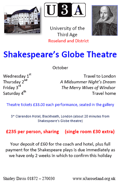 Booking is essential and places must be secured by the end of February so please contact Shirley Davis now on 01872 270030 to book your place.
