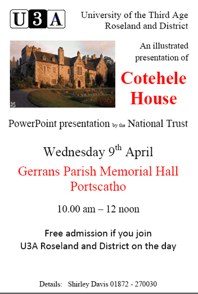 An illustrated presentation of Cotehele House by the National Trust at Gerrans Parish Memorial Hall, Portscatho, Cornwall. Free admission if you join U3A Roseland and District on the day. Details: Shirley Davis 01872 - 270030