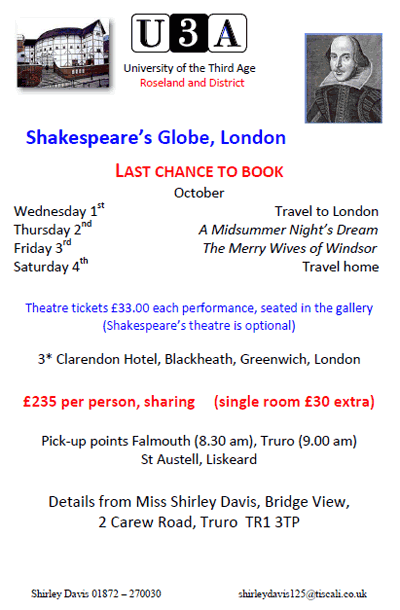 U3A Roseland and District October 4 day trip to Shakespeare's Globe, London. Last chance to book. A Midsummer Night's Dream and The Merry Wives of Windsor.