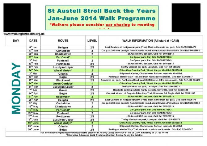For information regarding the Monday walks please call Ashley Cundy on 01726 61375 or Carol Hatherley on 01726 74108