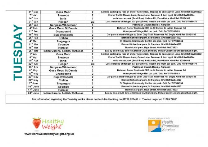For information regarding the Tuesday walks please contact Jan Hocking on 01726 823466 or Yvonne Lagor on 01726 72811