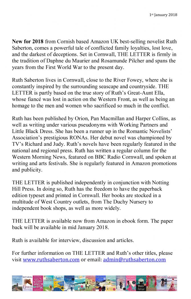 New for 2018 from Cornish based Amazon UK best-selling novelist Ruth Saberton, comes a powerful tale of conflicted family loyalties, lost love, and the darkest of deceptions. Set in Cornwall, THE LETTER is firmly in the tradition of Daphne du Maurier and Rosamunde Pilcher and spans the years from the First World War to the present day.