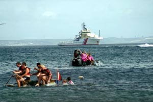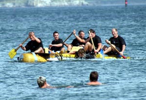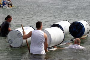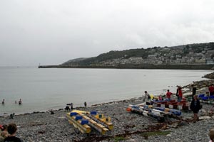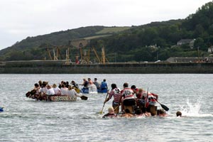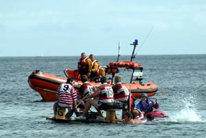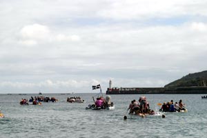 Newlyn Raft Race 2004. An annual event held in late August at The Green, Newlyn in support of Newlyn Christmas Lights. The two categories for entry are junior and adult. Entrants compete for trophies including the Perpetual Challenge Shield which is awarded to the raft with the greatest sponsorship. Other attractions include stalls and a Tug of War contest. For sponsorship forms etc: The Secretary, Newlyn Harbour Lights. Tel: +44 (0) 1736 350976